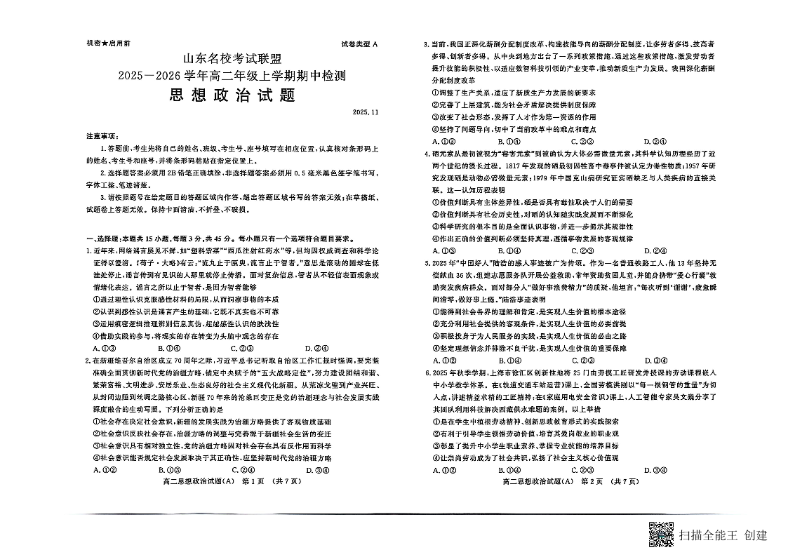 2025-2026山东名校考试联盟11月高二期中考试 政治.pdf