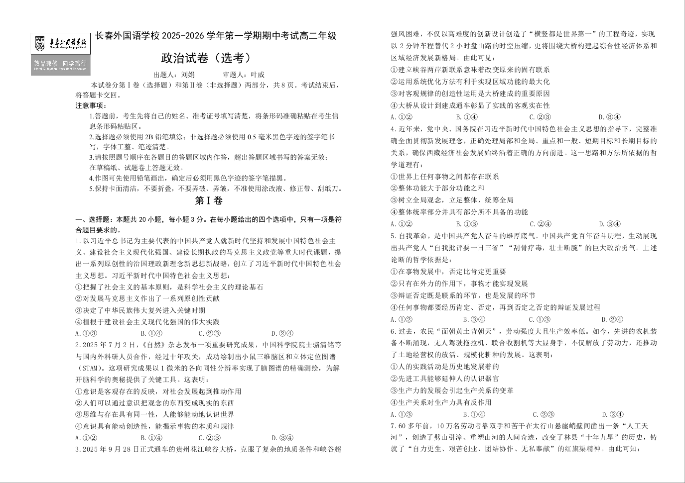 吉林省长春外国语学校2025-2026学年高二上学期期中考试 政治试题(含答案).docx