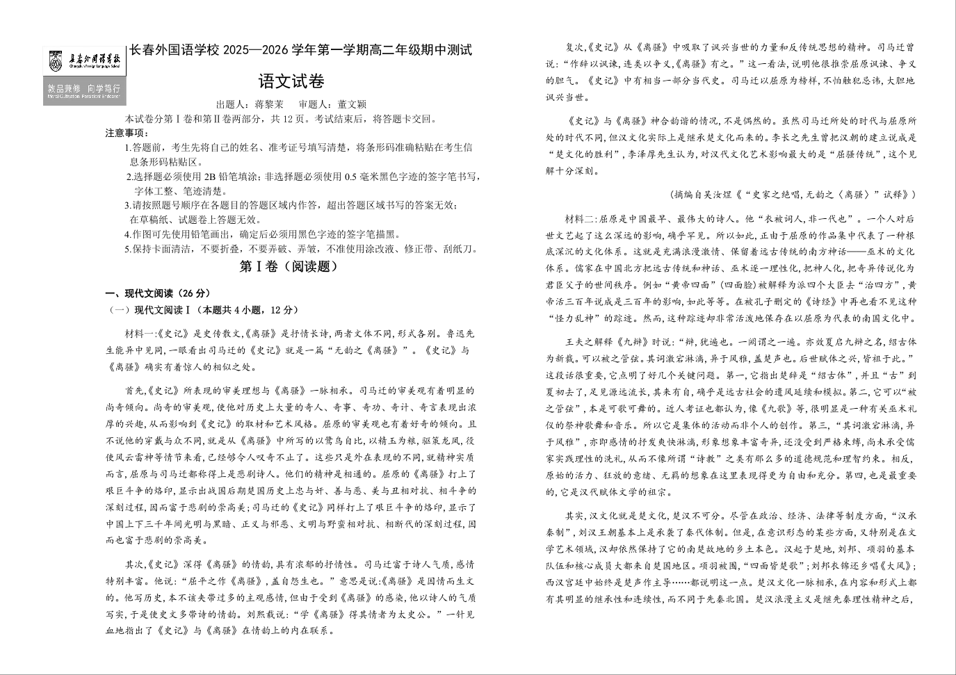 吉林省长春外国语学校2025-2026学年高二上学期期中考试 语文试题(含答案).docx