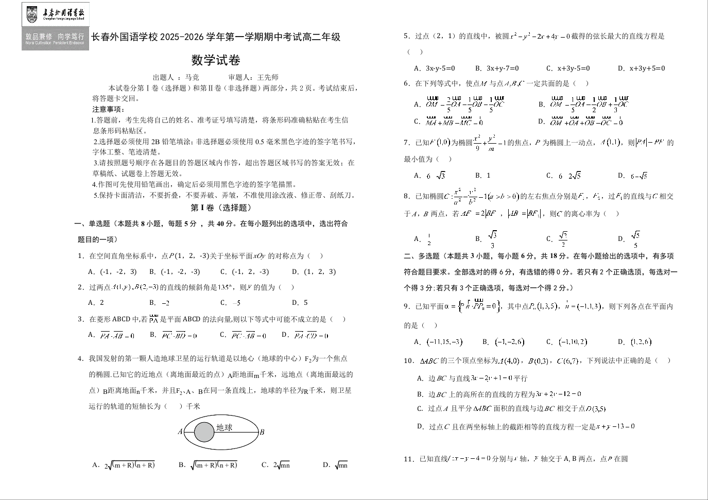 吉林省长春外国语学校2025-2026学年高二上学期期中考试 数学试题(含答案).docx