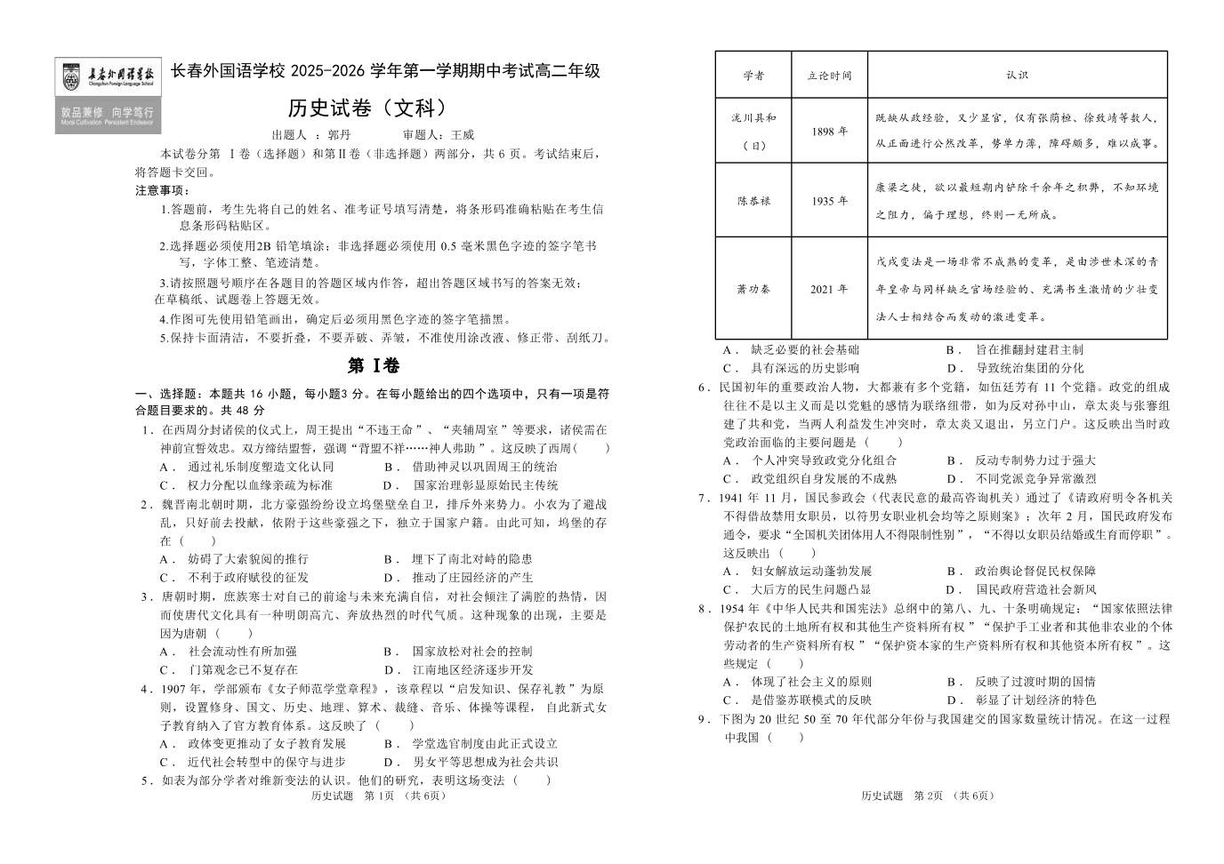 吉林省长春外国语学校2025-2026学年高二上学期期中考试 历史试题(含答案).pdf