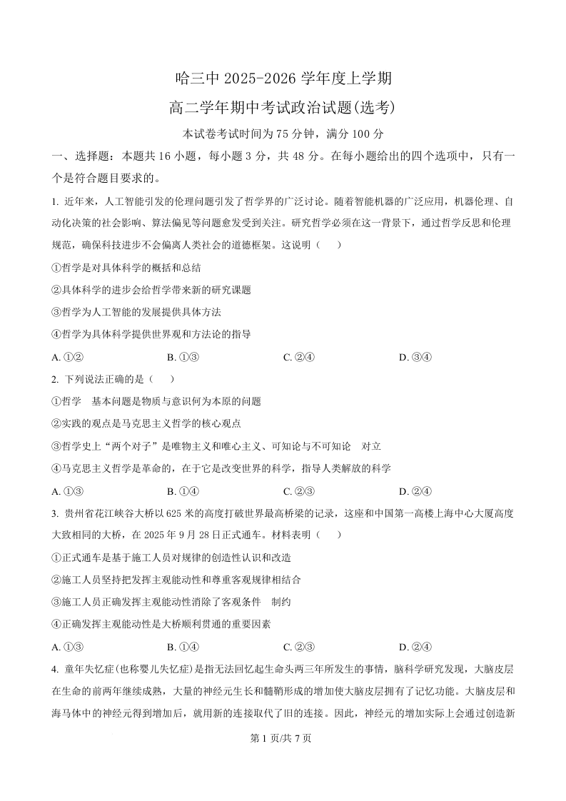 黑龙江省哈尔滨市第三中学2025-2026学年高二上学期期中考试 政治.docx
