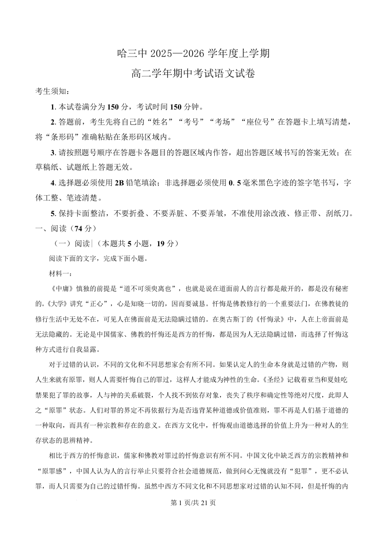 黑龙江省哈尔滨市第三中学2025-2026学年高二上学期期中考试 语文答案.docx