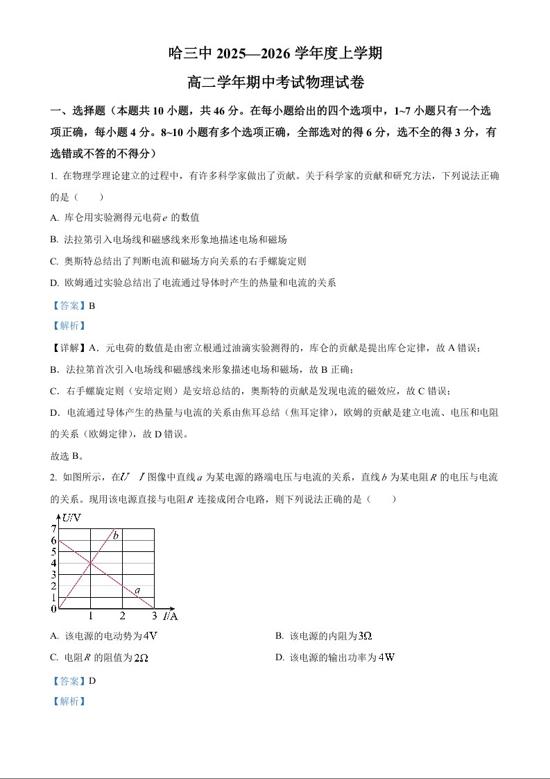 黑龙江省哈尔滨市第三中学2025-2026学年高二上学期期中考试 物理答案.docx