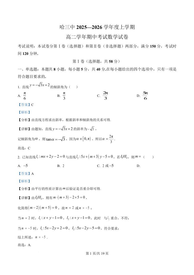 黑龙江省哈尔滨市第三中学2025-2026学年高二上学期期中考试 数学答案.docx