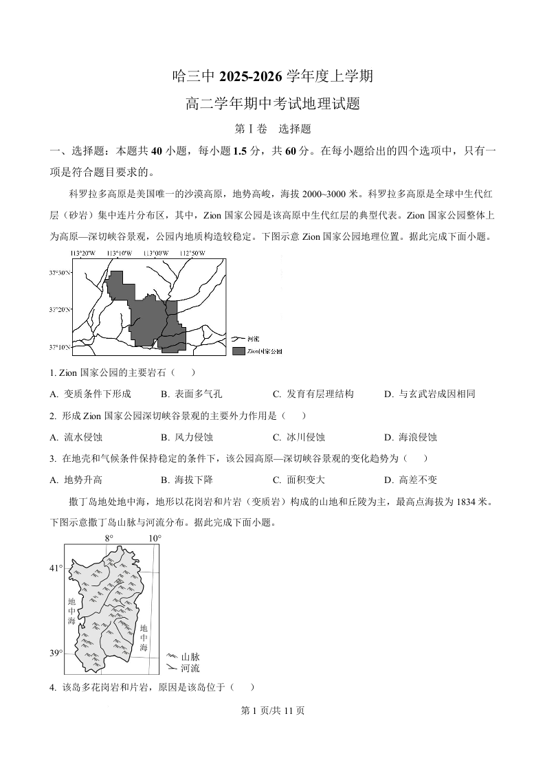 黑龙江省哈尔滨市第三中学2025-2026学年高二上学期期中考试 地理.docx