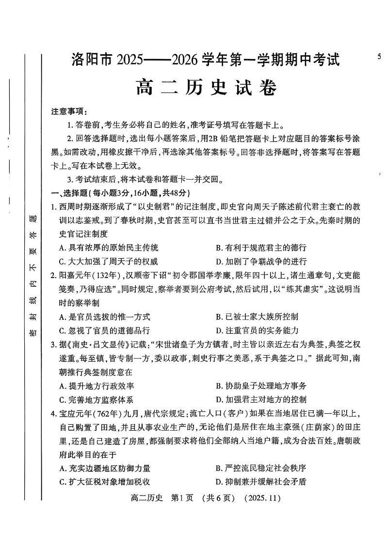 河南省洛阳市2025-2026学年高二上学期期中考试 历史试题(含答案).pdf