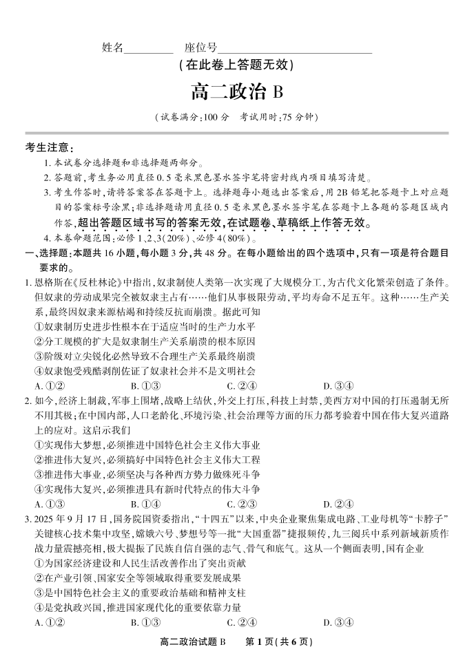 政治B·2025年11月高二期中联考.pdf