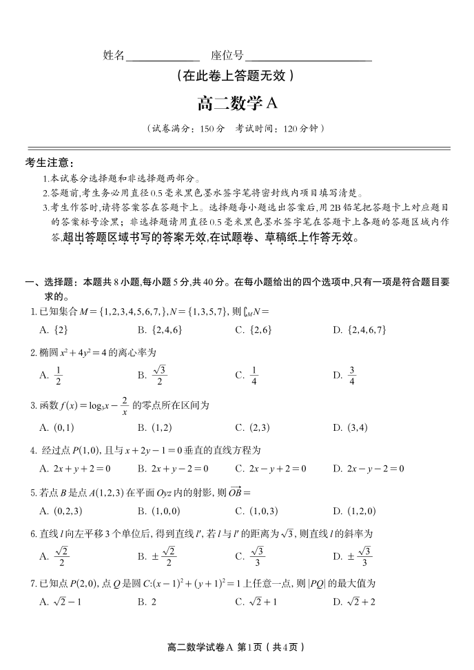 数学A·2025年11月高二期中联考.pdf