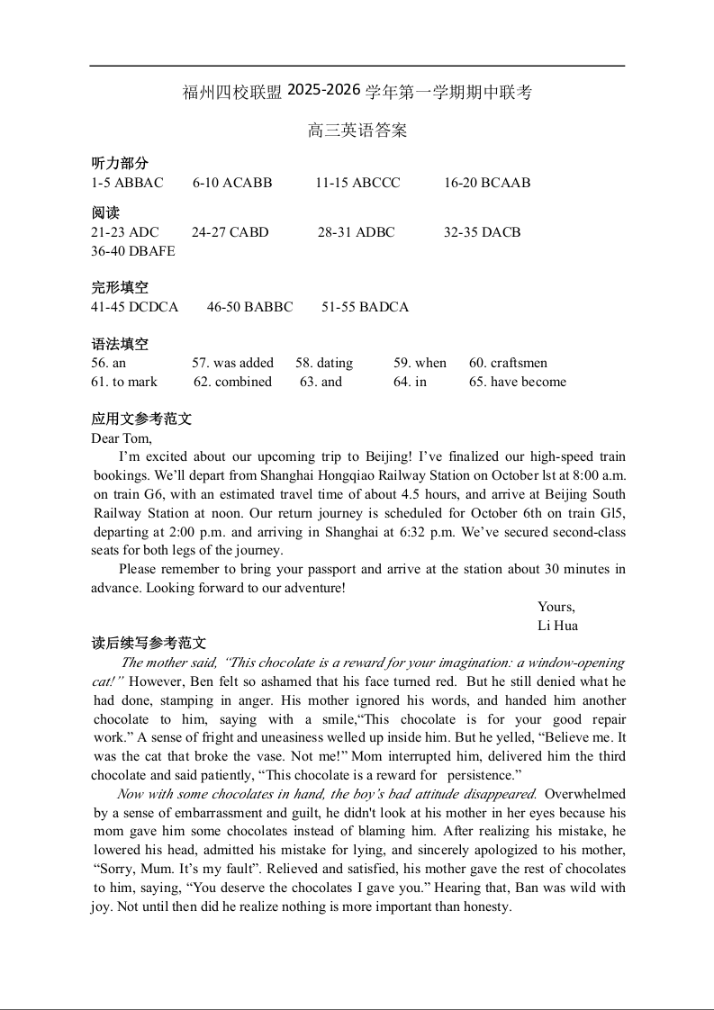 福建省福州市四校联盟2025-2026学年高三上学期期中联考 英语答案.docx