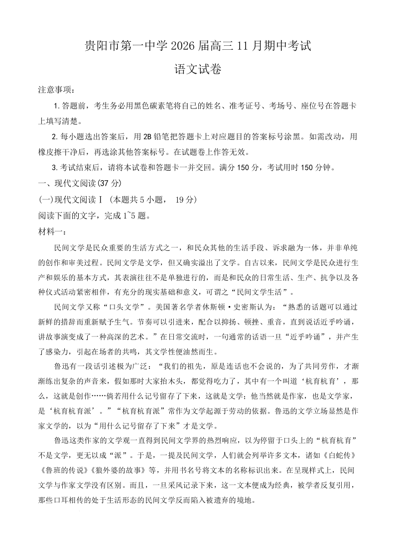 贵阳市第一中学2026届高三上学期11月期中考试 语文.docx