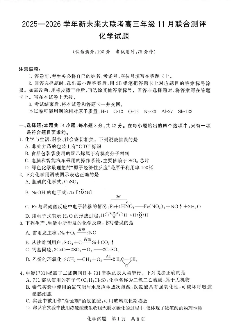 新未来大联考2025一2026学年高三年级11月联合测评 化学.pdf