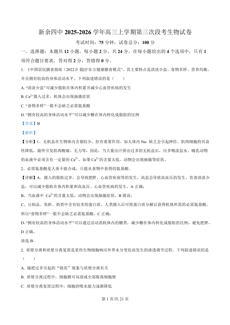 江西省新余市第四中学2026届高三上学期11月第三次段考 生物答案.docx