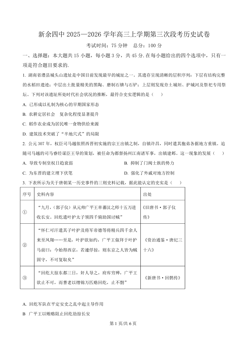 江西省新余市第四中学2026届高三上学期11月第三次段考 历史.docx