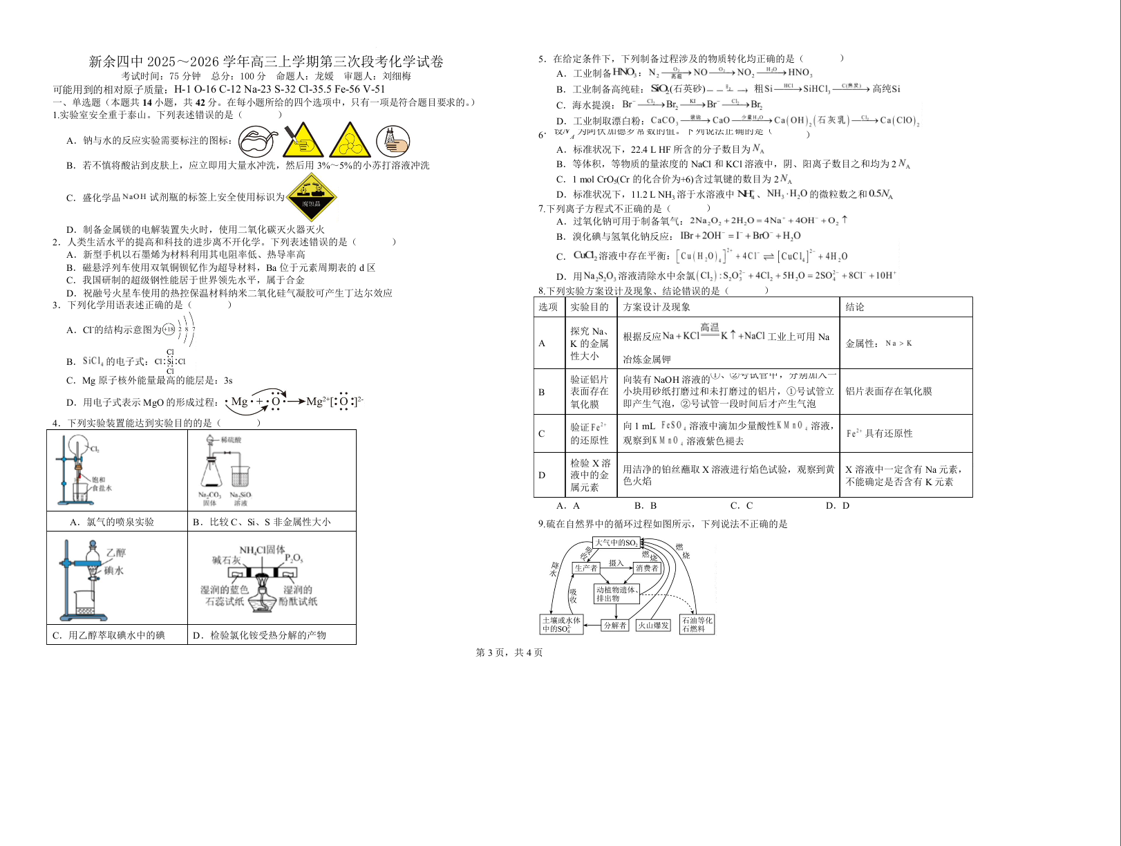 江西省新余市第四中学2026届高三上学期11月第三次段考 化学.docx