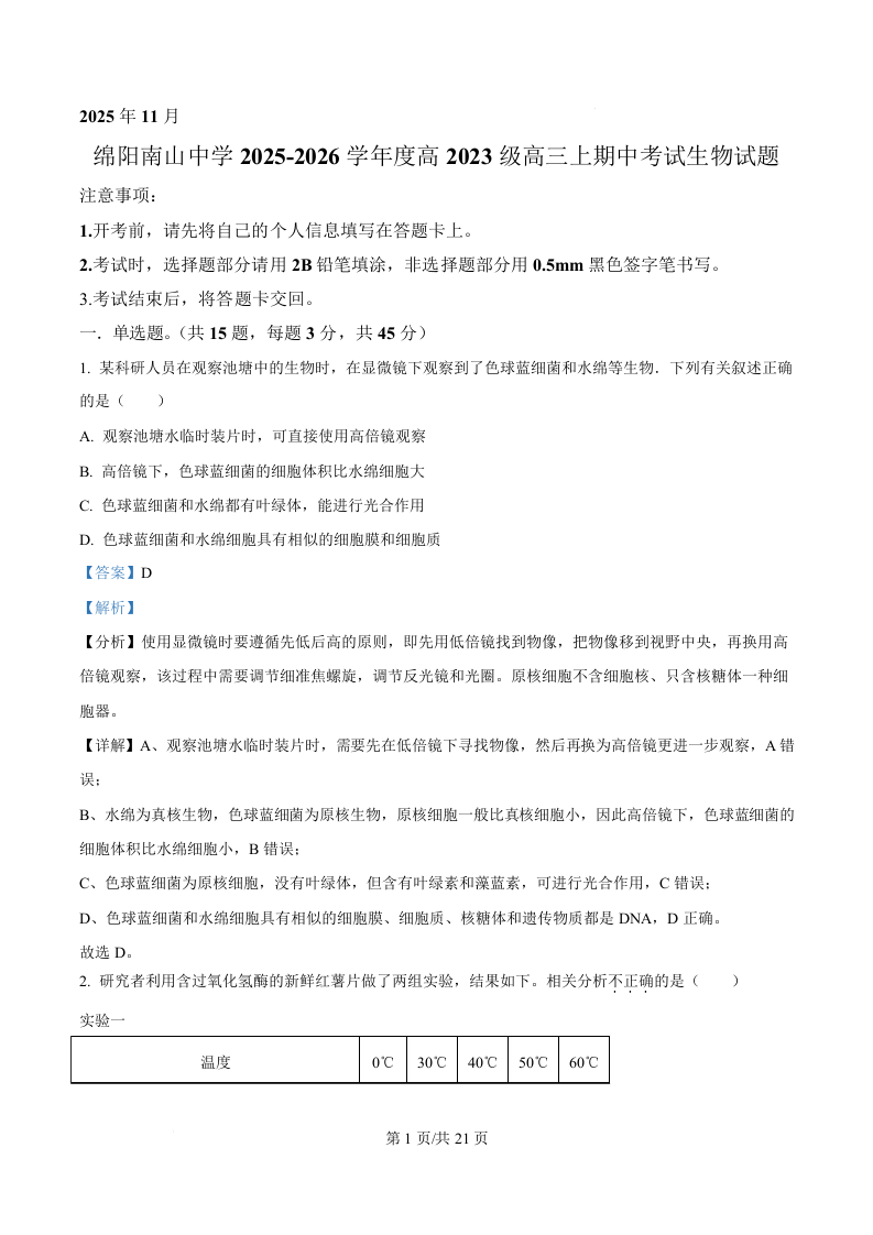 四川省绵阳南山中学2026届高三上学期11月期中考试 生物答案.docx