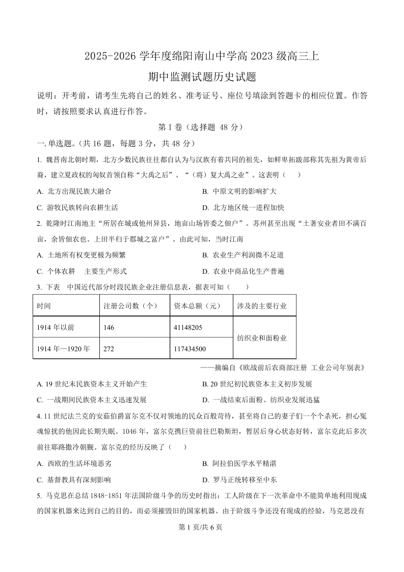 四川省绵阳南山中学2026届高三上学期11月期中考试 历史.docx