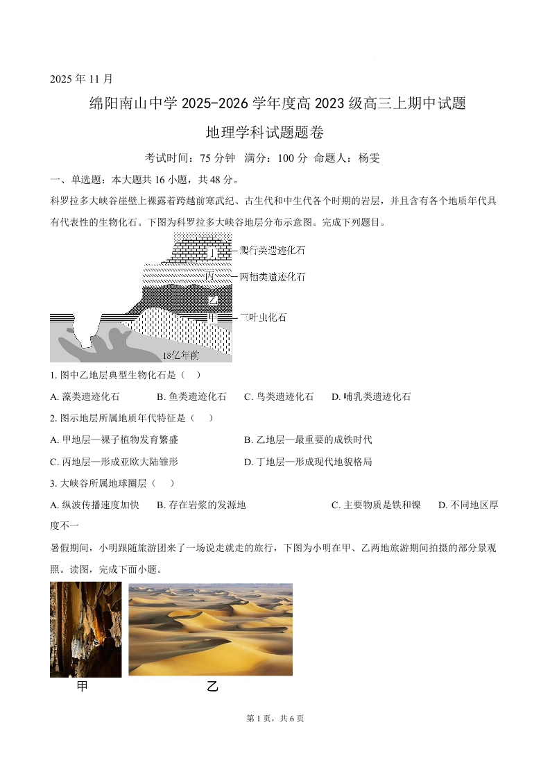 四川省绵阳南山中学2026届高三上学期11月期中考试 地理试题(含答案).docx