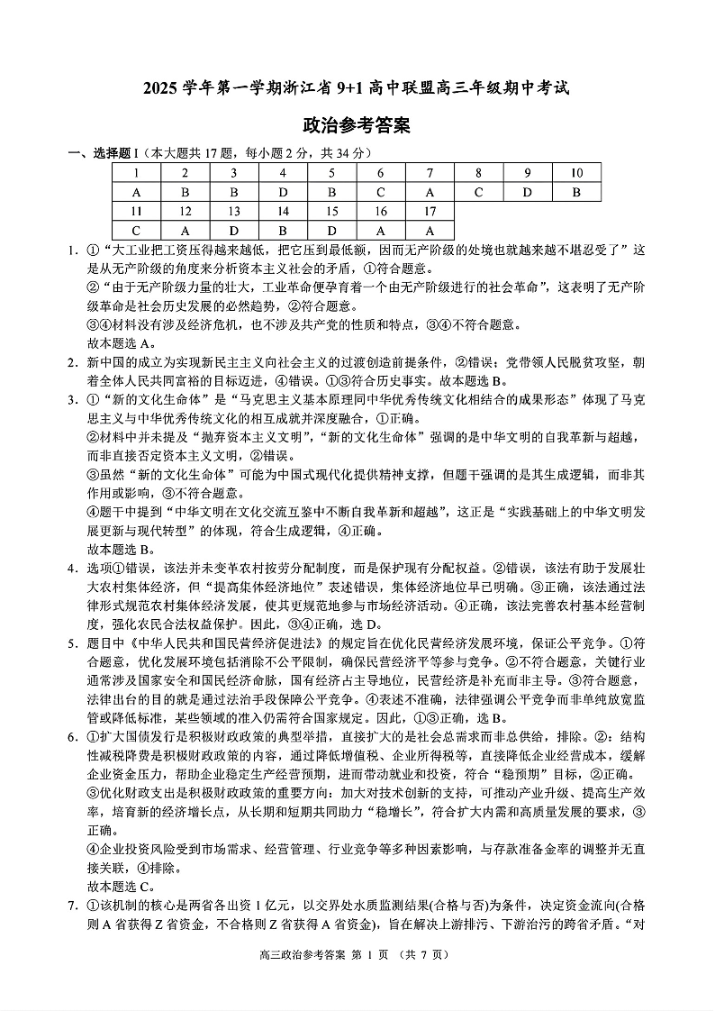 浙江省9+1高中联盟2025学年第一学期高三年级期中考试 政治答案.pdf