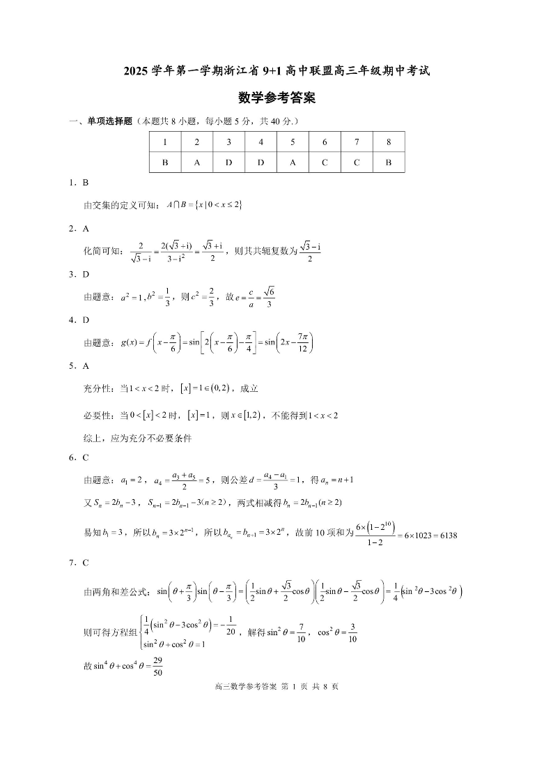 浙江省9+1高中联盟2025学年第一学期高三年级期中考试 数学答案.pdf
