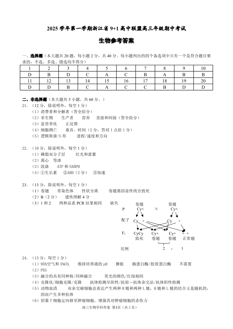 浙江省9+1高中联盟2025学年第一学期高三年级期中考试 生物答案.pdf