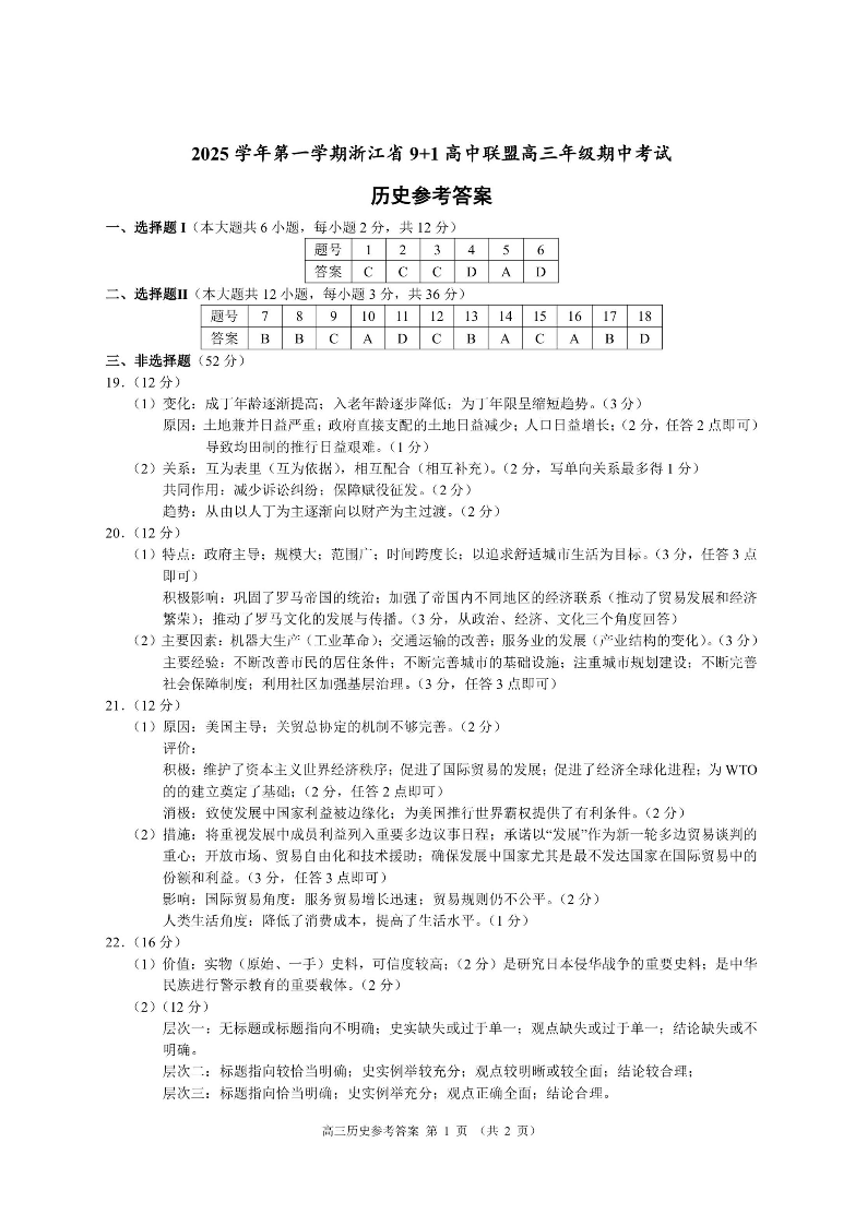 浙江省9+1高中联盟2025学年第一学期高三年级期中考试 历史答案.pdf