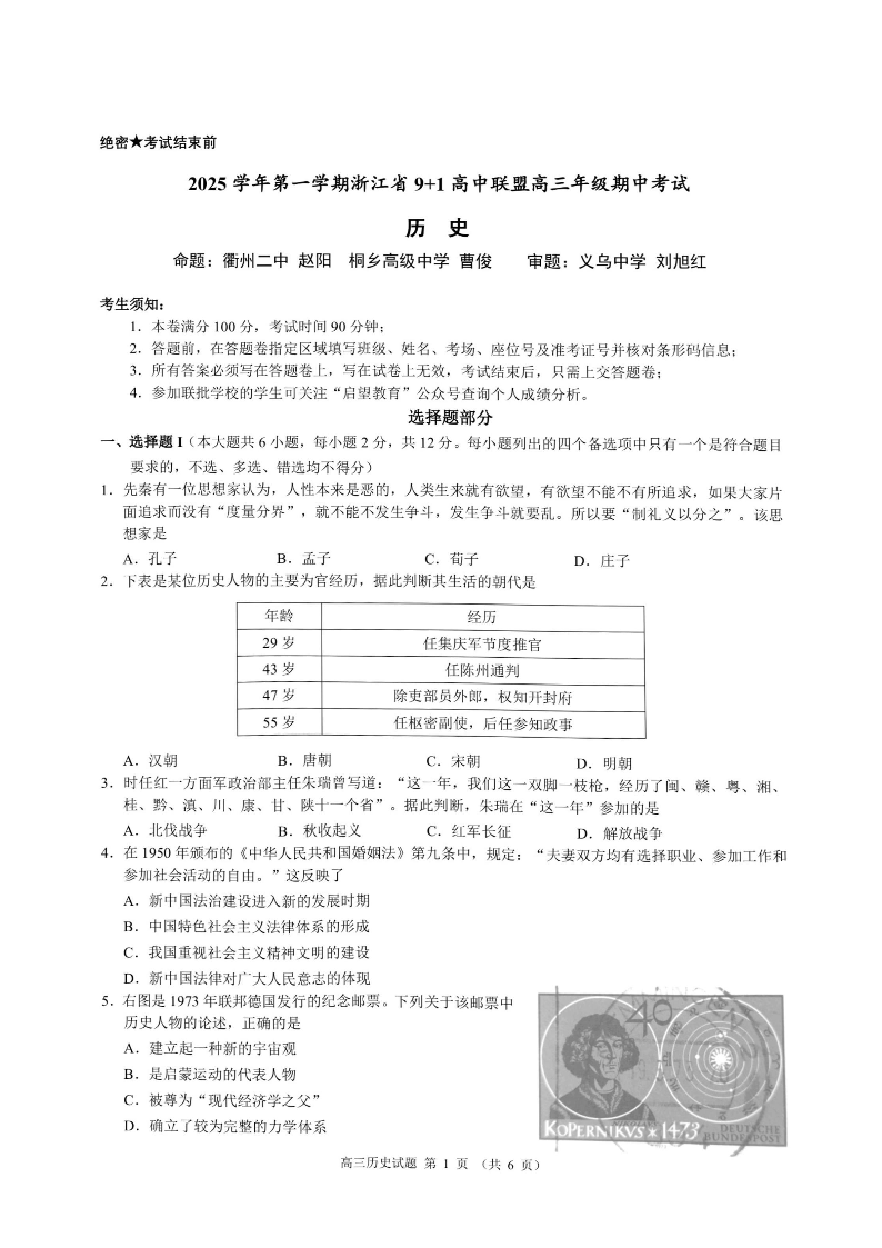 浙江省9+1高中联盟2025学年第一学期高三年级期中考试 历史.pdf