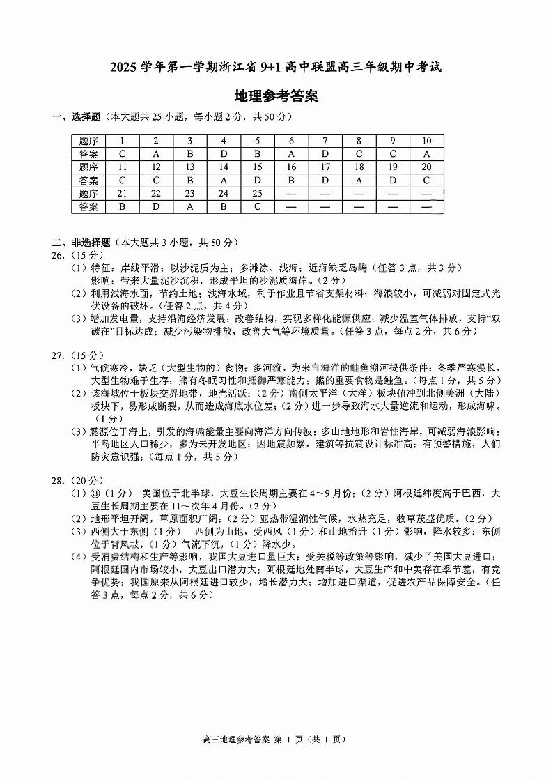 浙江省9+1高中联盟2025学年第一学期高三年级期中考试 地理答案.pdf