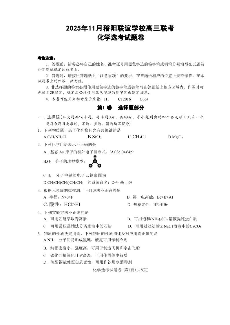 浙江省稽阳联谊学校2025年11月高三上学期期中联考 化学.pdf