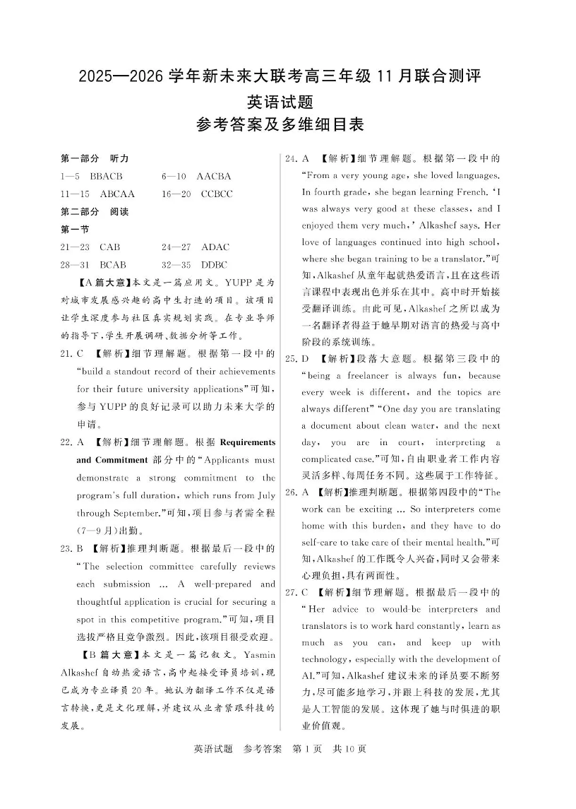 新未来大联考2025一2026学年高三年级11月联合测评 英语答案.pdf