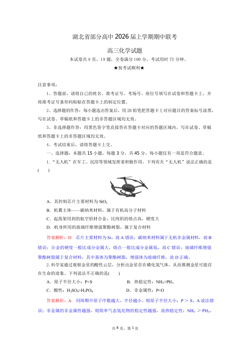 湖北省部分高中2025-2026学年高三上学期期中联考 化学答案.docx