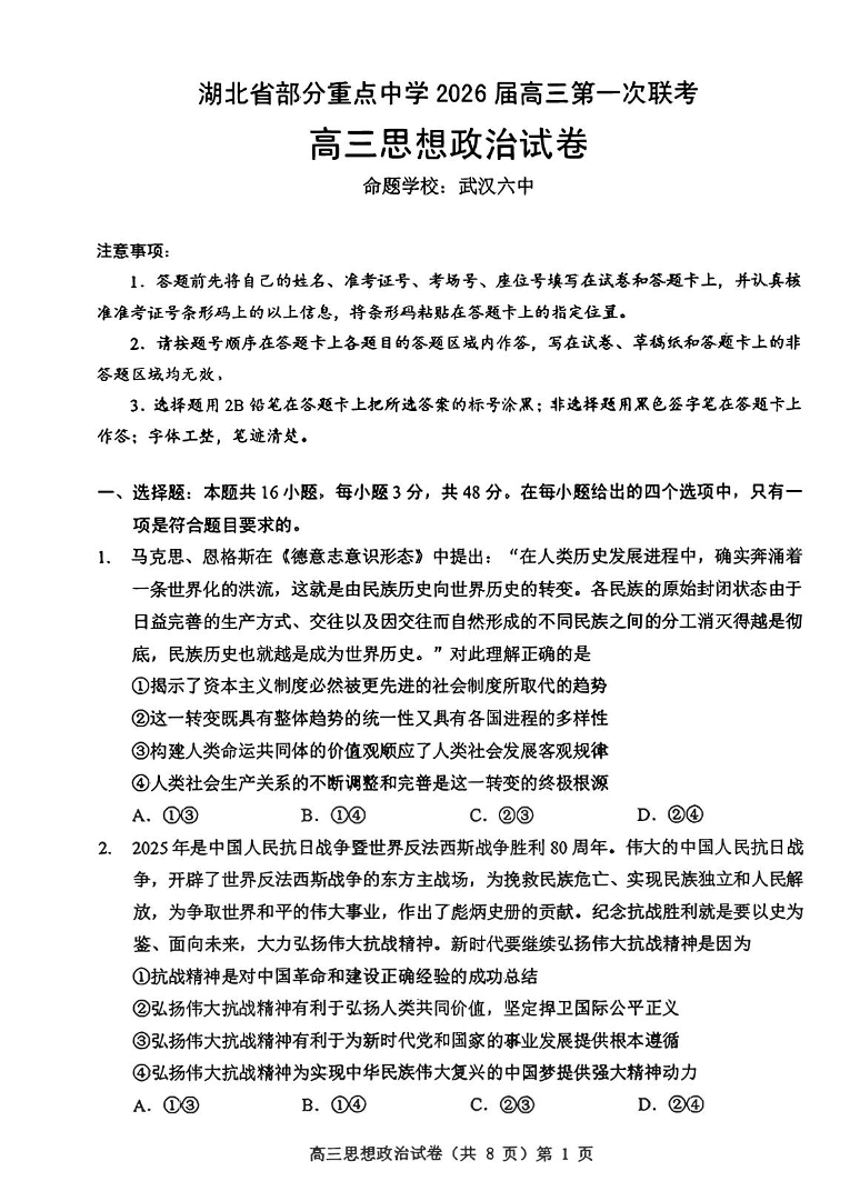 湖北省武汉市部分重点中学2026届高三第一次联考 政治.pdf