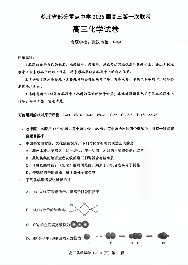 湖北省武汉市部分重点中学2026届高三第一次联考 化学.pdf