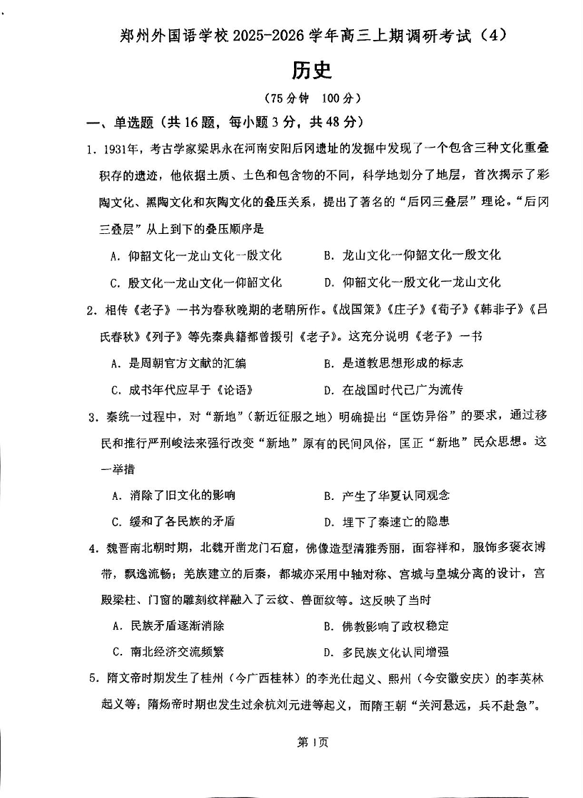 郑州外国语学校2025-2026学年上期高三调研4考试试卷 历史.pdf