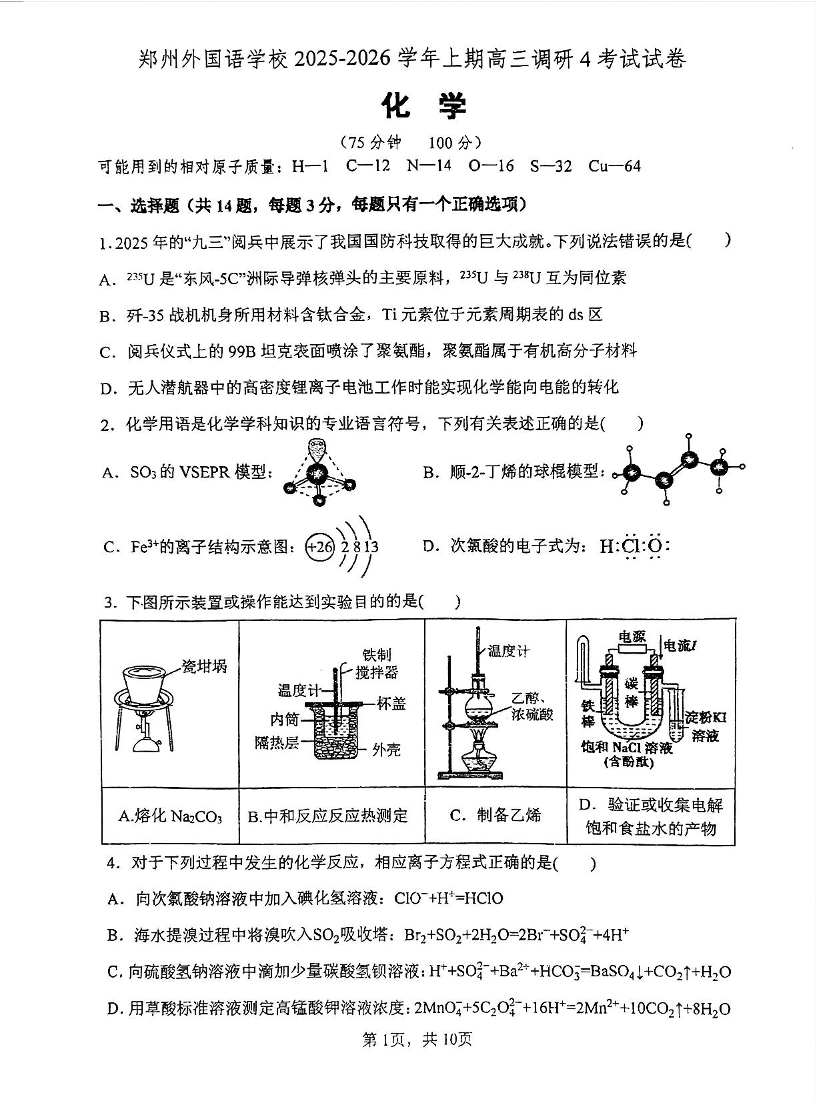 郑州外国语学校2025-2026学年上期高三调研4考试试卷 化学.pdf