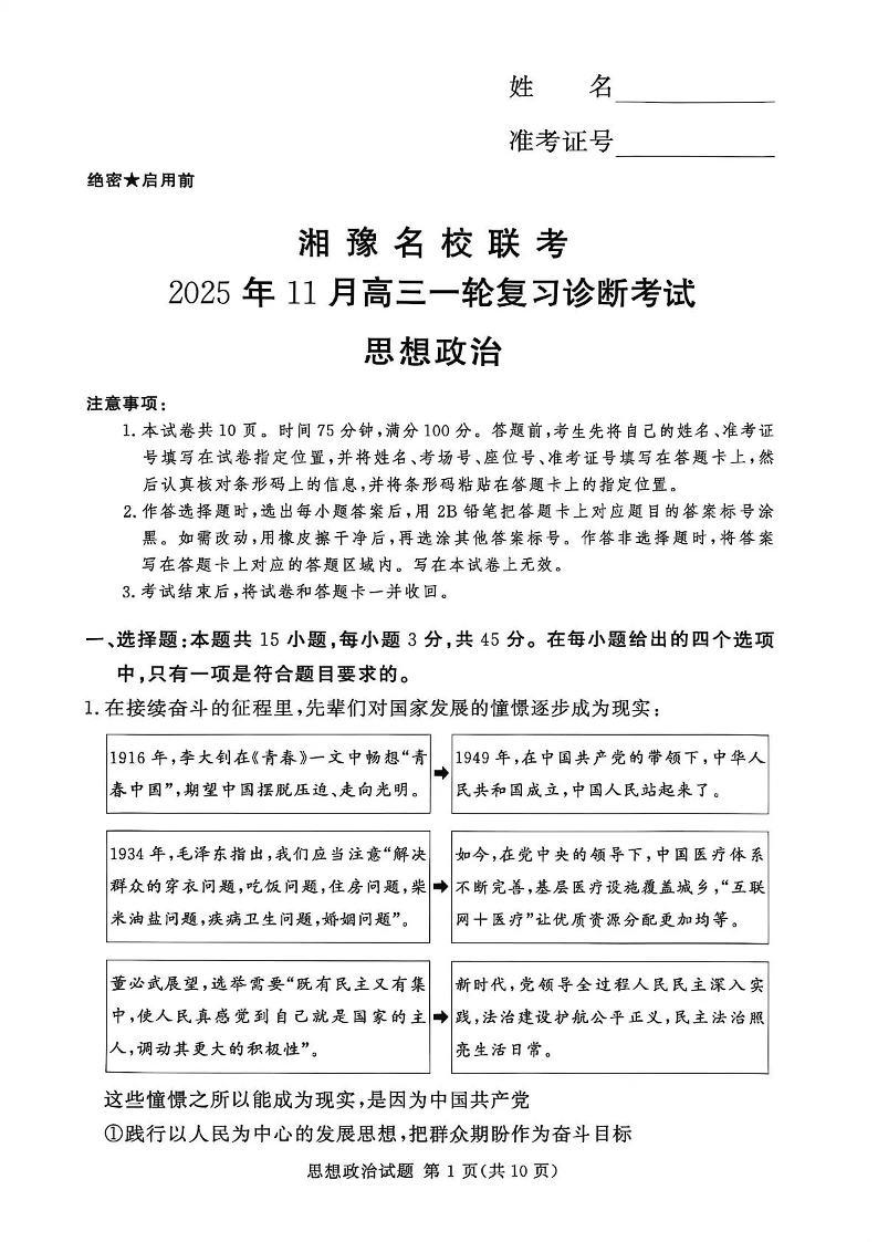 湘豫名校联考2025年11月高三一轮复习诊断考试 政治.pdf