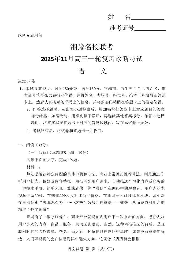 湘豫名校联考2025年11月高三一轮复习诊断考试 语文.pdf