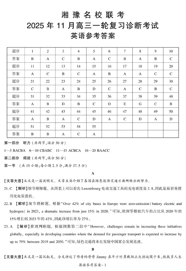 湘豫名校联考2025年11月高三一轮复习诊断考试 英语答案.pdf