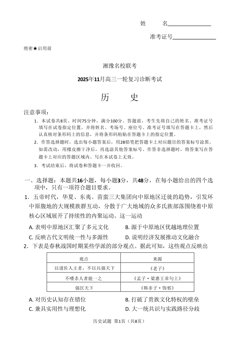 湘豫名校联考2025年11月高三一轮复习诊断考试 历史.pdf