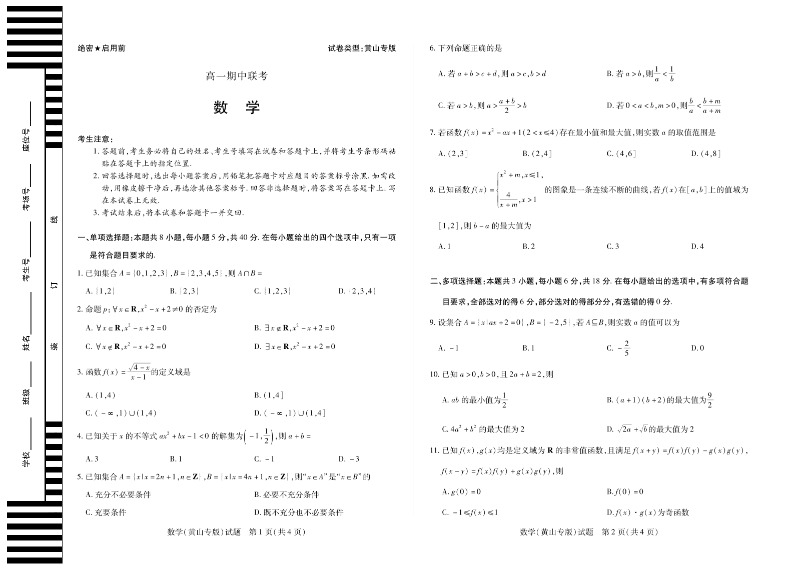 【数学黄山专版】天一大联考·安徽省2025-2026学年高一上学期期中联考.pdf