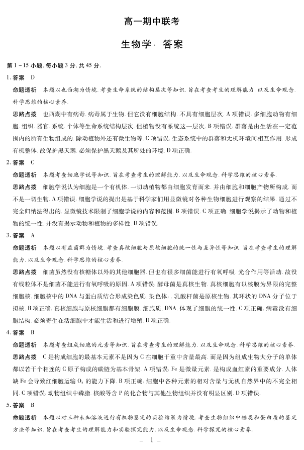 【生物学答案】天一大联考·安徽省2025-2026学年高一上学期期中联考.pdf