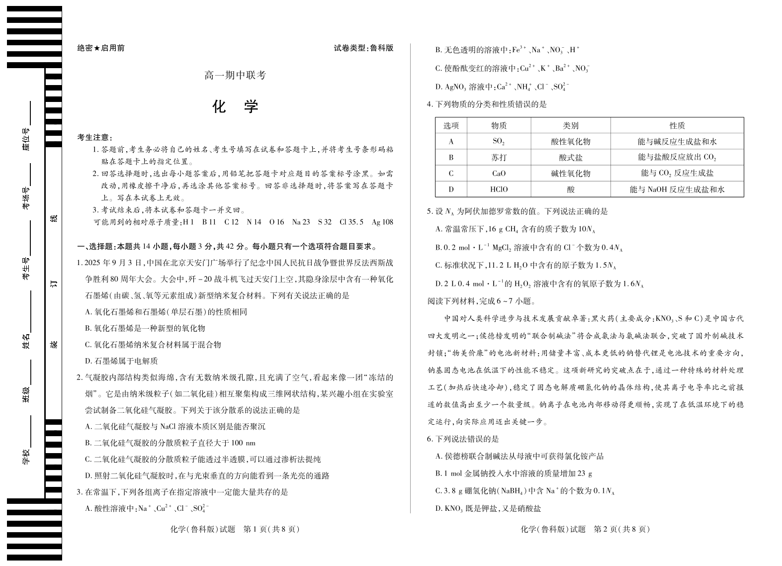 【化学鲁科版】天一大联考·安徽省2025-2026学年高一上学期期中联考.pdf