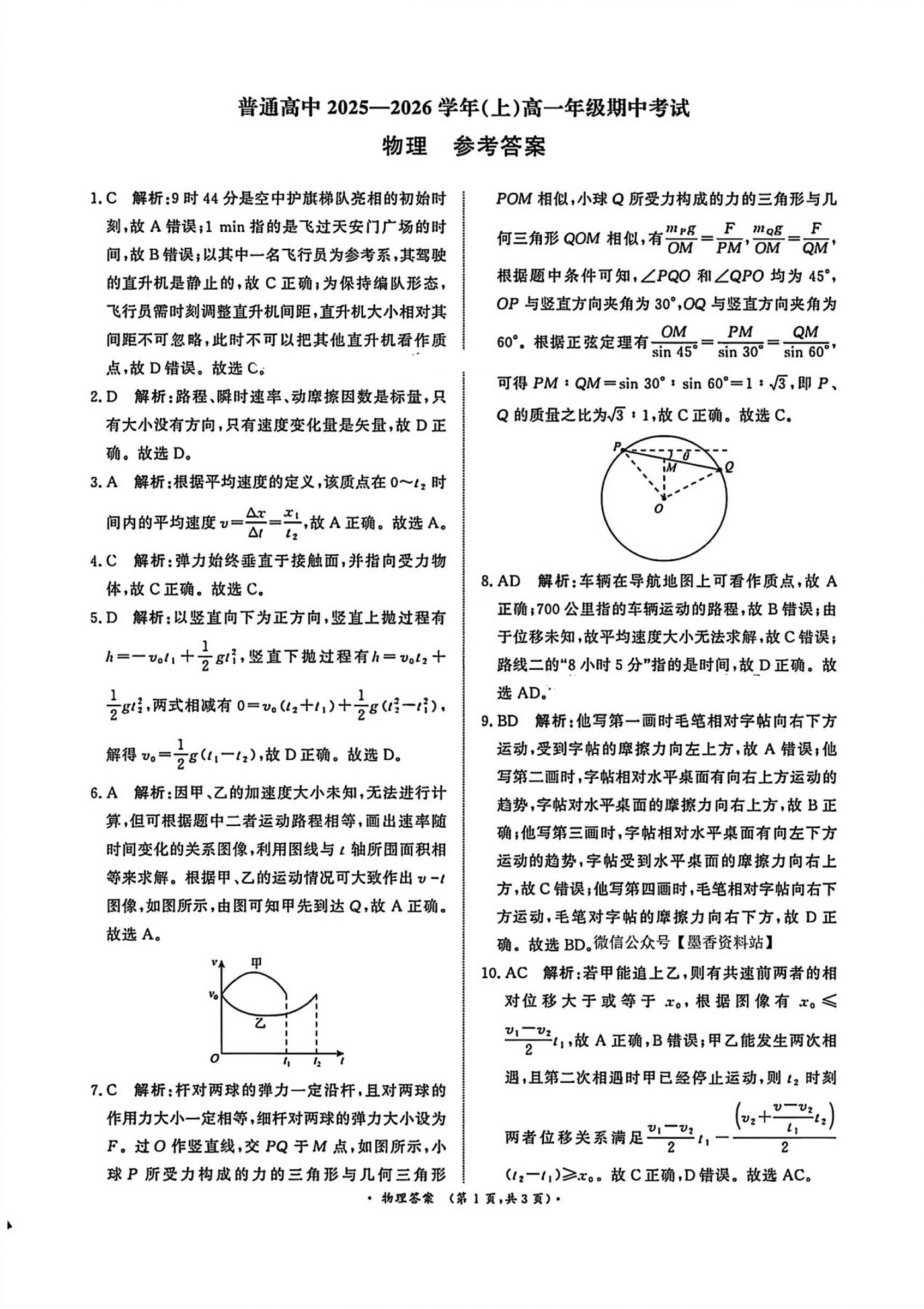 青桐鸣大联考2025-2026学年(上)高一年级期中考试 物理答案.pdf