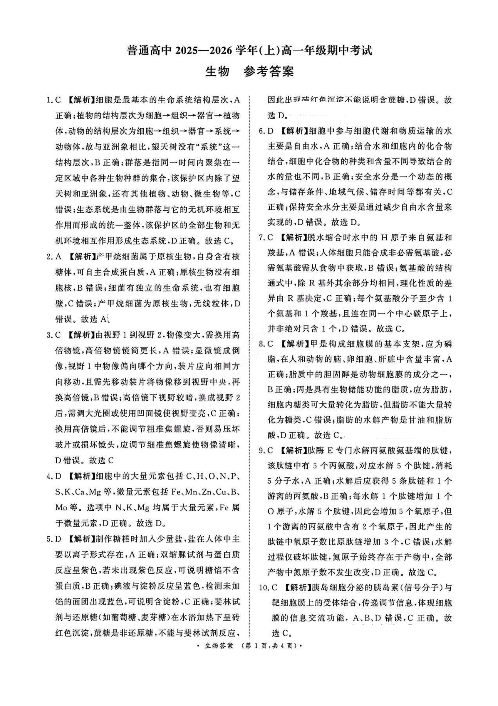 青桐鸣大联考2025-2026学年(上)高一年级期中考试 生物答案.pdf