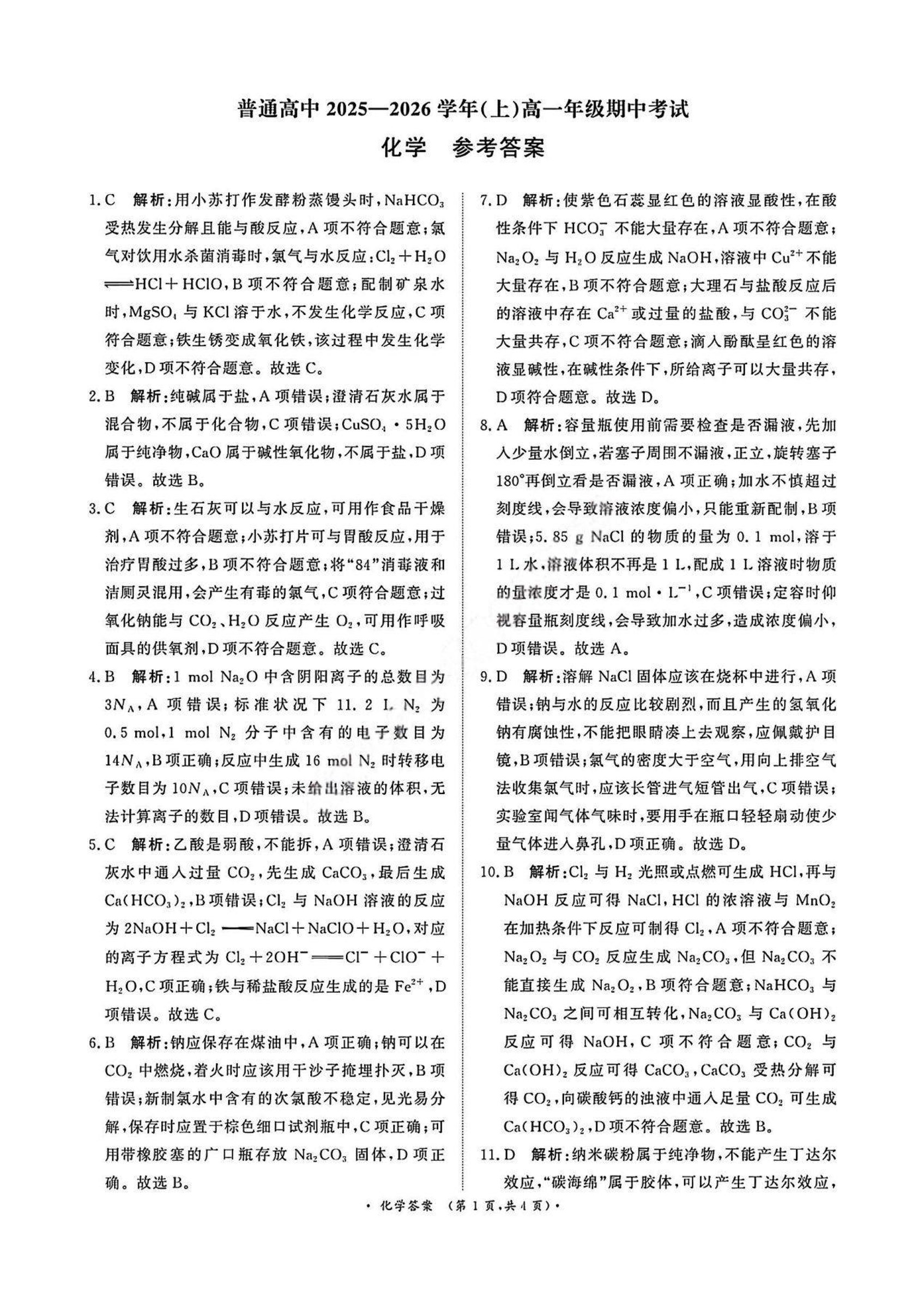 青桐鸣大联考2025-2026学年(上)高一年级期中考试 化学答案.pdf