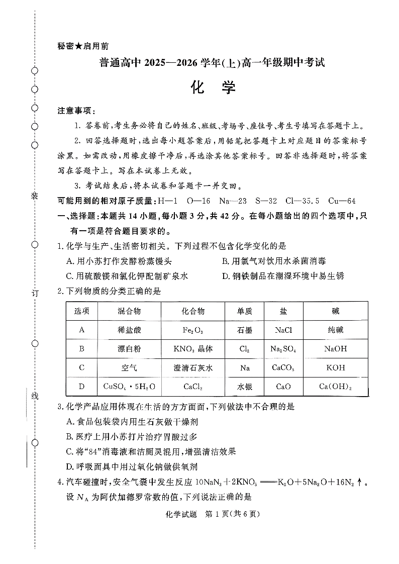 青桐鸣大联考2025-2026学年(上)高一年级期中考试 化学.pdf
