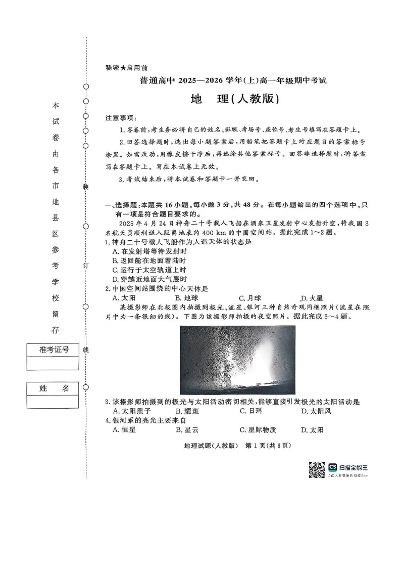 青桐鸣大联考2025-2026学年(上)高一年级期中考试 地理.pdf
