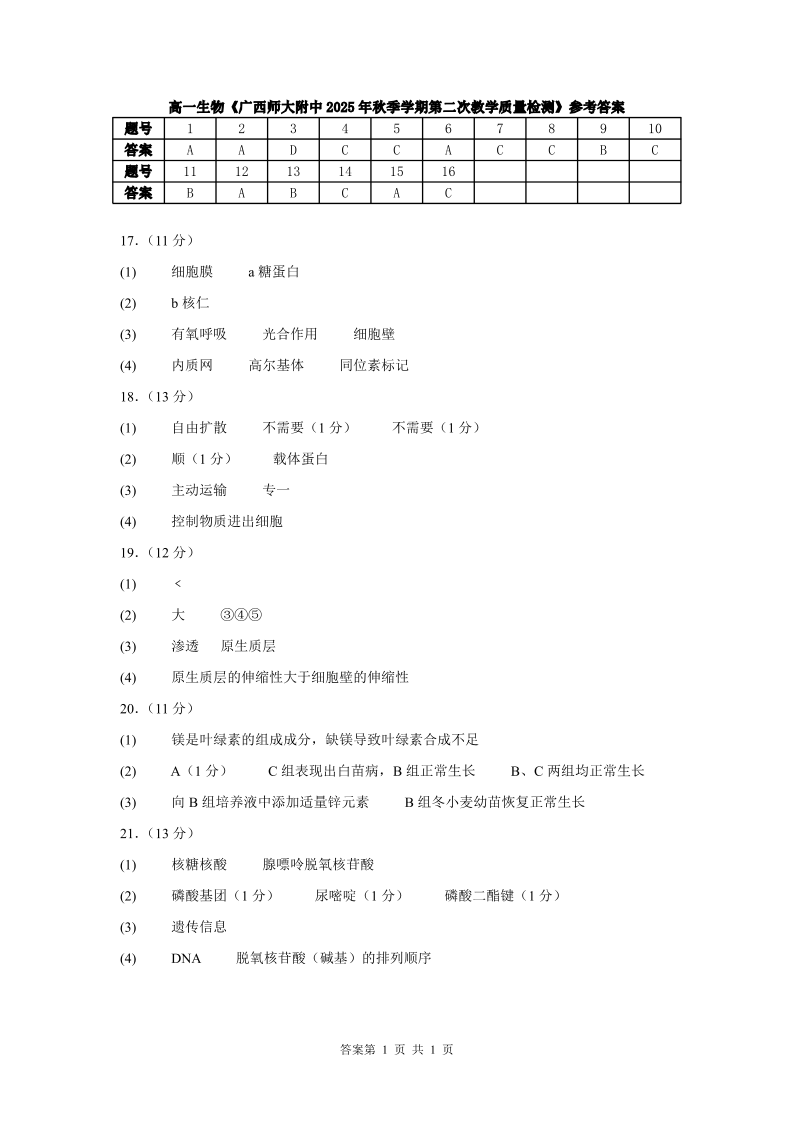 桂林师大附中2025年秋季期中高一生物答案.pdf