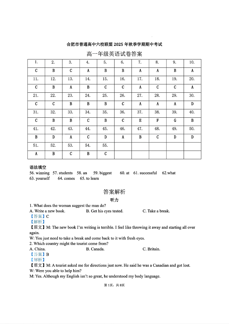 合肥市普通高中六校联盟2025年秋季学期高一年级期中考试 英语答案.pdf