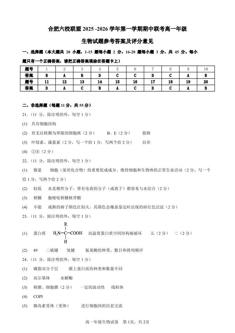 合肥市普通高中六校联盟2025年秋季学期高一年级期中考试 生物答案.pdf